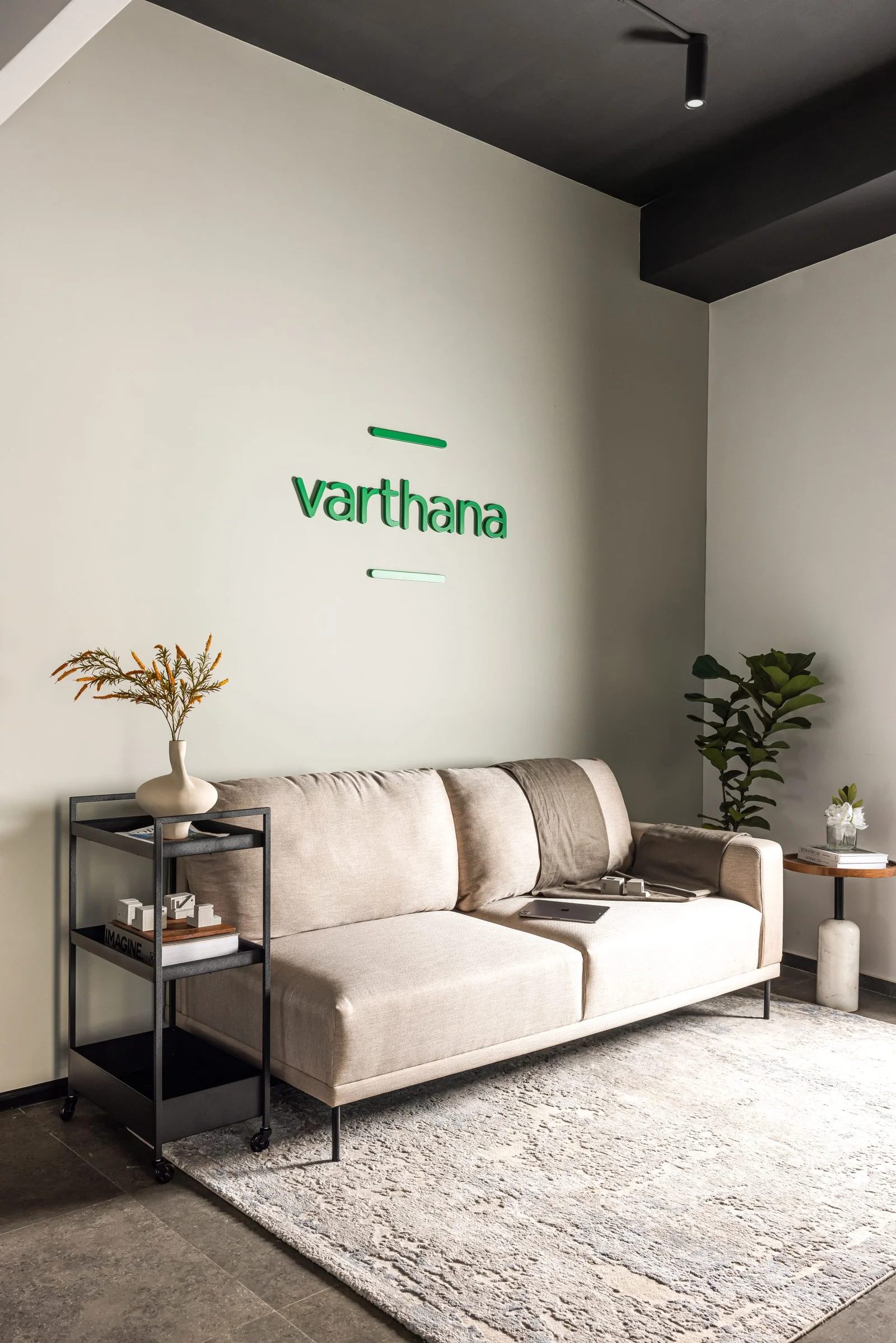Varthana, India's largest school loan provider, needed a new headquarters that reflected its mission of making education accessible. Alottus inherited a bare-shell space with exposed beams and uneven floors — and chose to embrace these structural quirks rather than conceal them, weaving them into the design narrative as quiet focal points.