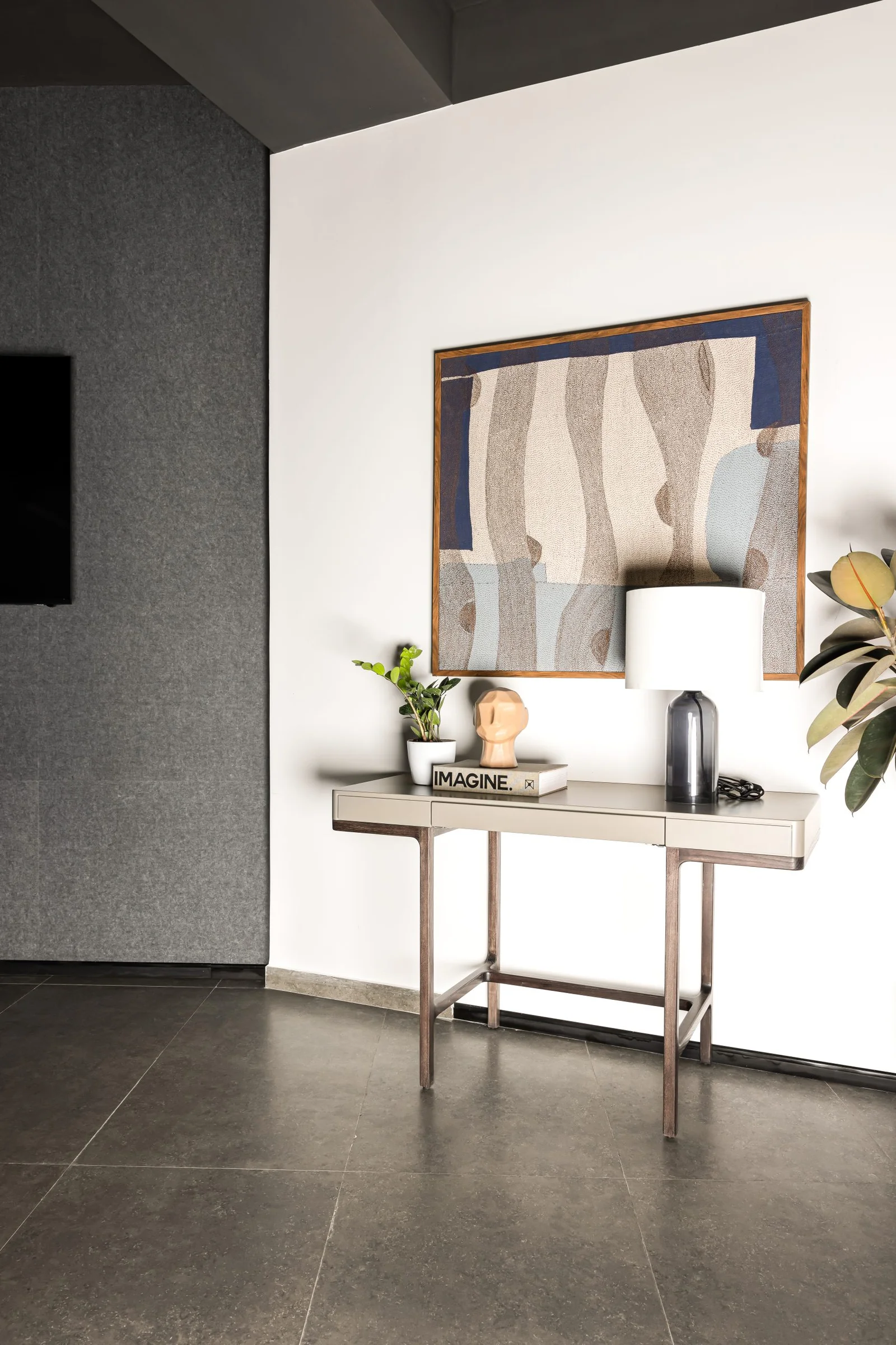 The entrance opens into a serene waiting lounge with an earthy palette, curated art, and lush greenery that immediately set a calming tone. Soft grey unifies floors and ceilings across open-plan workstations, while custom oak cabinetry integrates storage seamlessly into the architecture. A glass-enclosed conference room anchors the space with clean geometry and a linear wooden table. Natural light floods in generously through large windows, complemented by warm linear lighting after dark. Oak, walnut, and nature-inspired accents run throughout — from the kitchen to the washrooms crafting an office that feels as purposeful and grounded as the brand it houses.